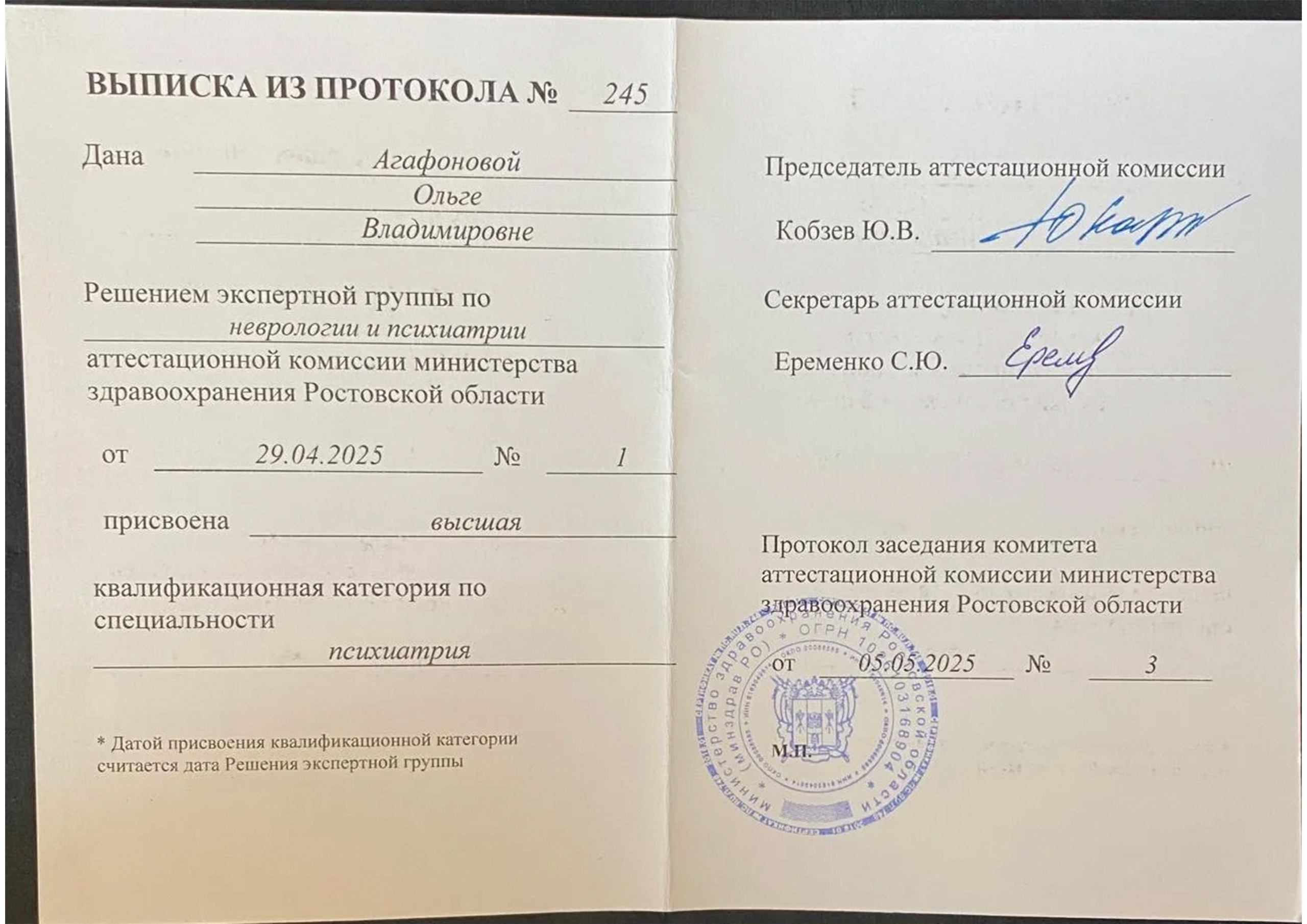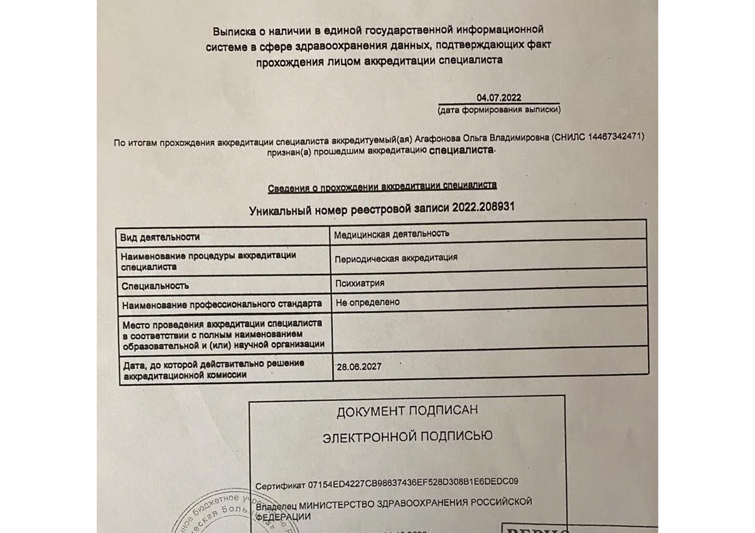 Специализация: диагностика и лечение депрессий, неврозов, шизофрении, нарушений памяти, обсессивно-компульсивных расстройств.